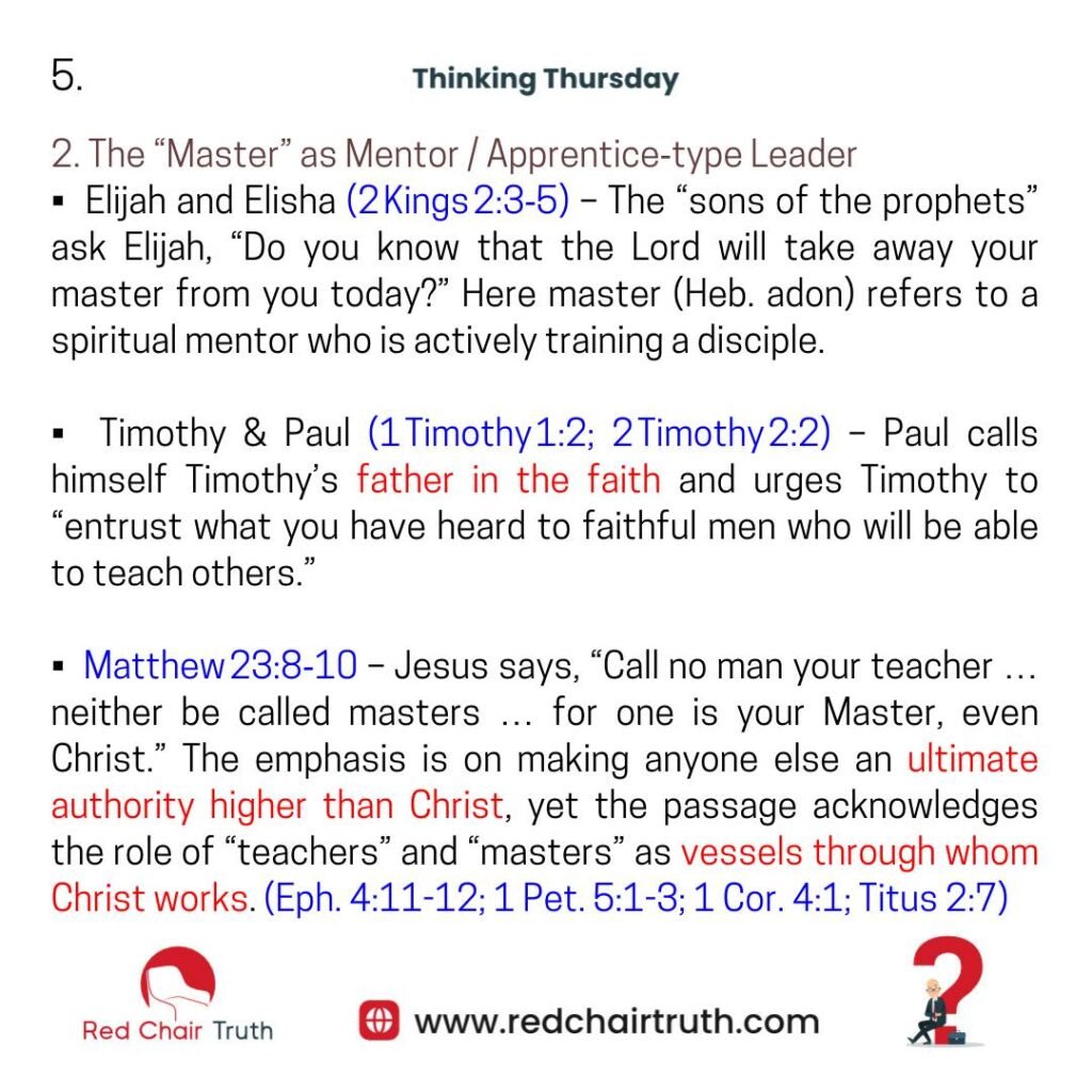 · Elijah and Elisha (2 Kings 2:3-5) – The “sons of the prophets” ask Elijah, “Do you know that the Lord will take away your master from you today?” Here master (Heb. adon) refers to a spiritual mentor who is actively training a disciple.