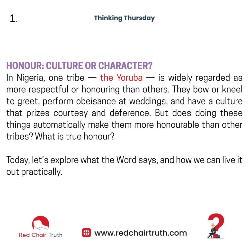 In Nigeria, one tribe — the Yoruba — is widely regarded as more respectful or honouring than others. They bow or kneel to greet, perform obeisance at weddings, and have a culture that prizes courtesy and deference. But does doing these things automatically make them more honourable than other tribes? What is true honour?