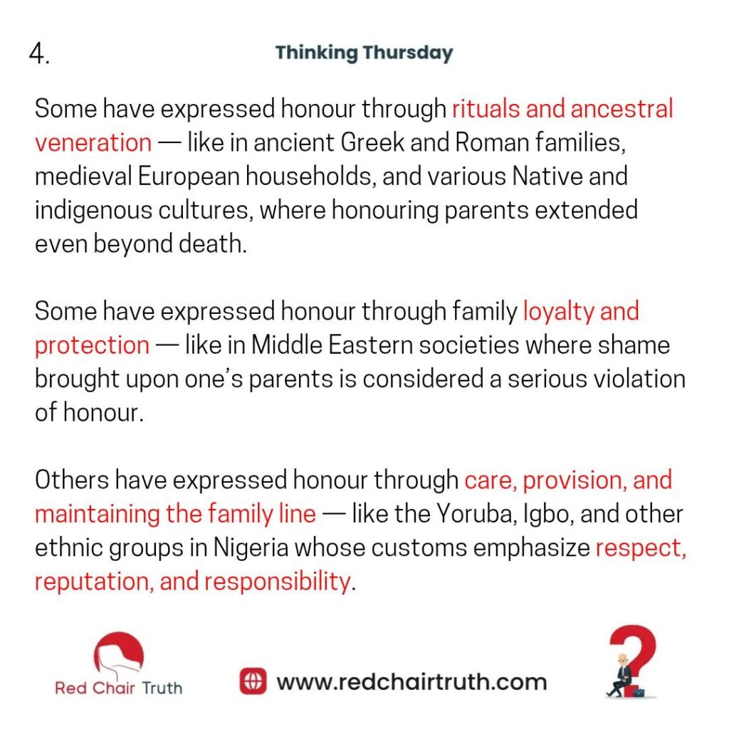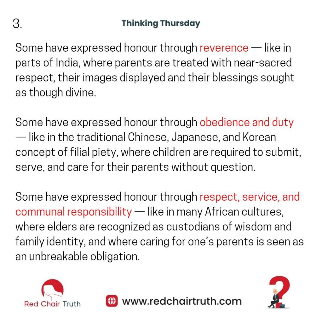 Some have expressed honour through respect, service, and communal responsibility — like in many African cultures, where elders are recognized as custodians of wisdom and family identity, and where caring for one’s parents is seen as an unbreakable obligation.