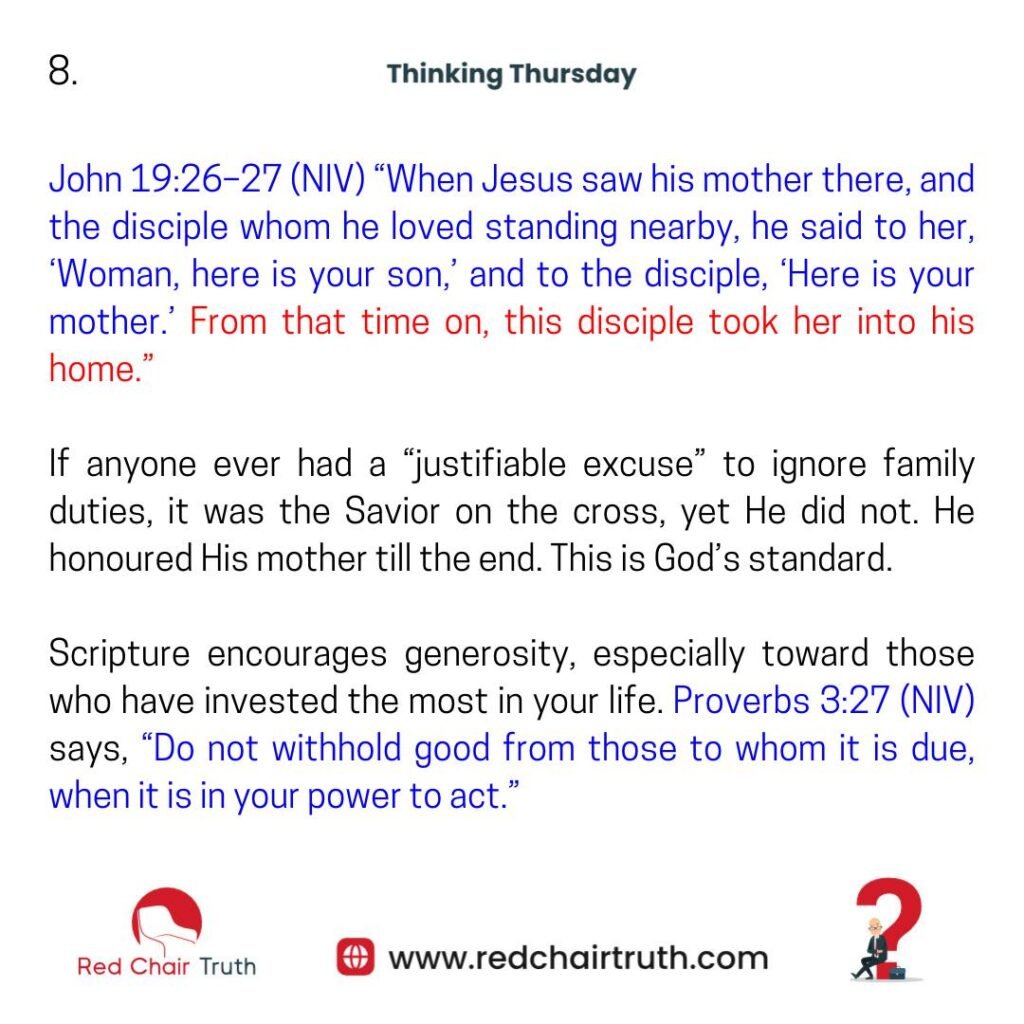 If anyone ever had a “justifiable excuse” to ignore family duties, it was the Savior on the cross, yet He did not. He honoured His mother till the end. This is God’s standard.