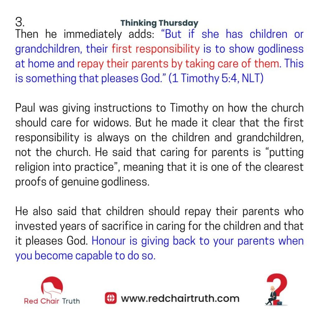 Paul was giving instructions to Timothy on how the church should care for widows. But he made it clear that the first responsibility is always on the children and grandchildren, not the church. He said that caring for parents is “putting religion into practice”, meaning that it is one of the clearest proofs of genuine godliness. He also said that children should repay their parents who invested years of sacrifice in caring for the children and that it pleases God. Honour is giving back to your parents when you become capable to do so.