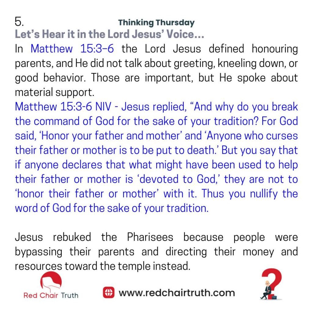 In Matthew 15:3–6 the Lord Jesus defined honouring parents, and He did not talk about greeting, kneeling down, or good behavior. Those are important, but He spoke about material support.