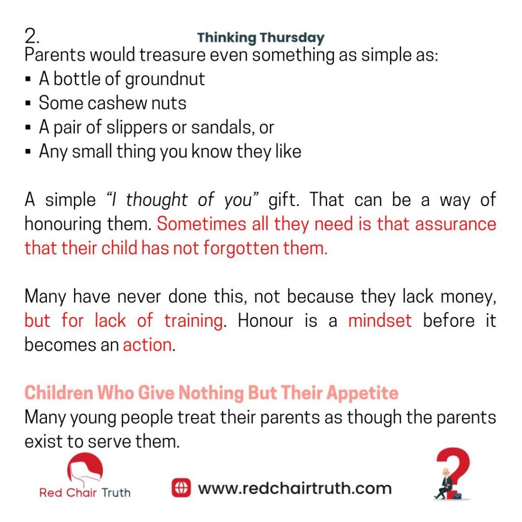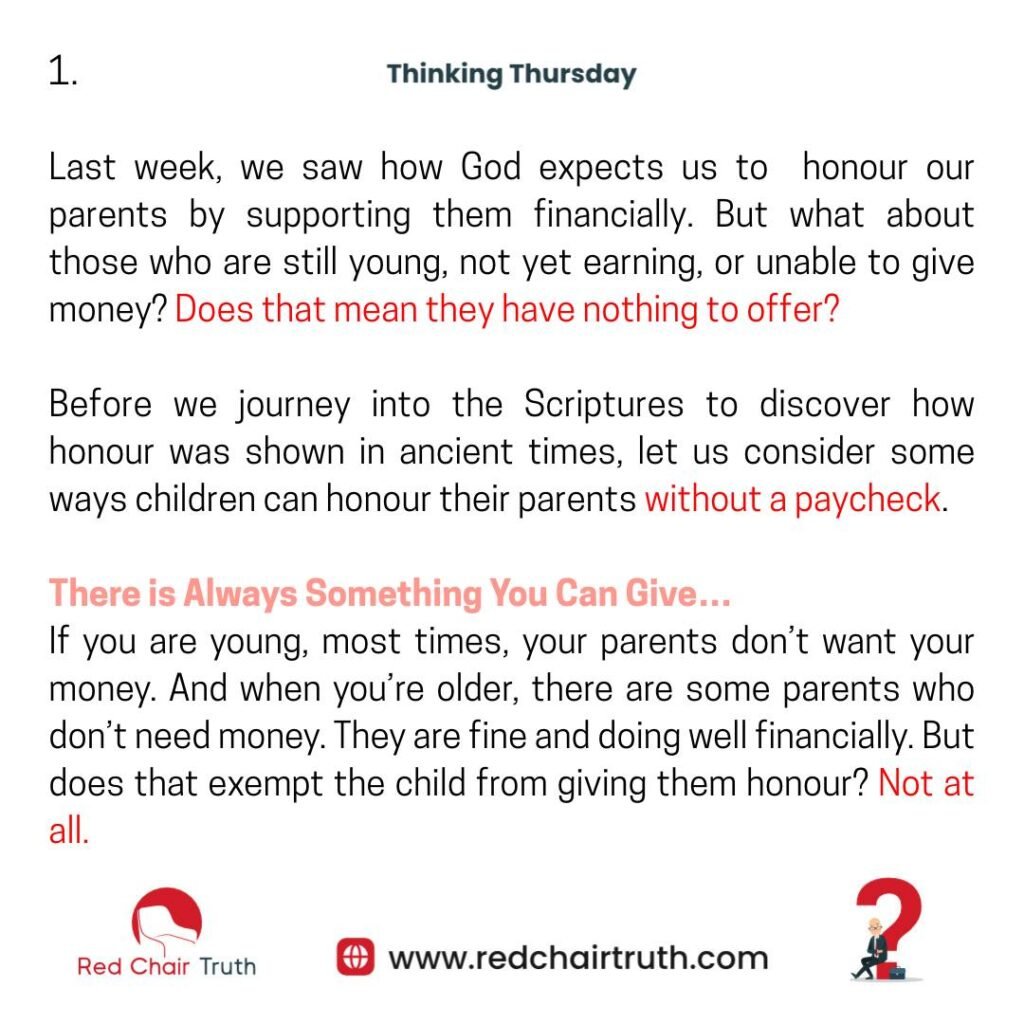 If you are young, most times, your parents don’t want your money. And when you’re older, there are some parents who don’t need money. They are fine and doing well financially. But does that exempt the child from giving them honour? Not at all.