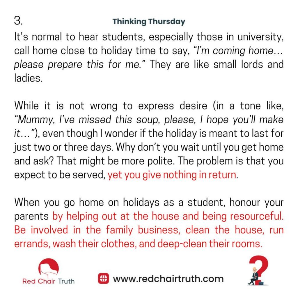 It’s normal to hear students, especially those in university, call home close to holiday time to say, “I’m coming home… please prepare this for me.” They are like small lords and ladies.