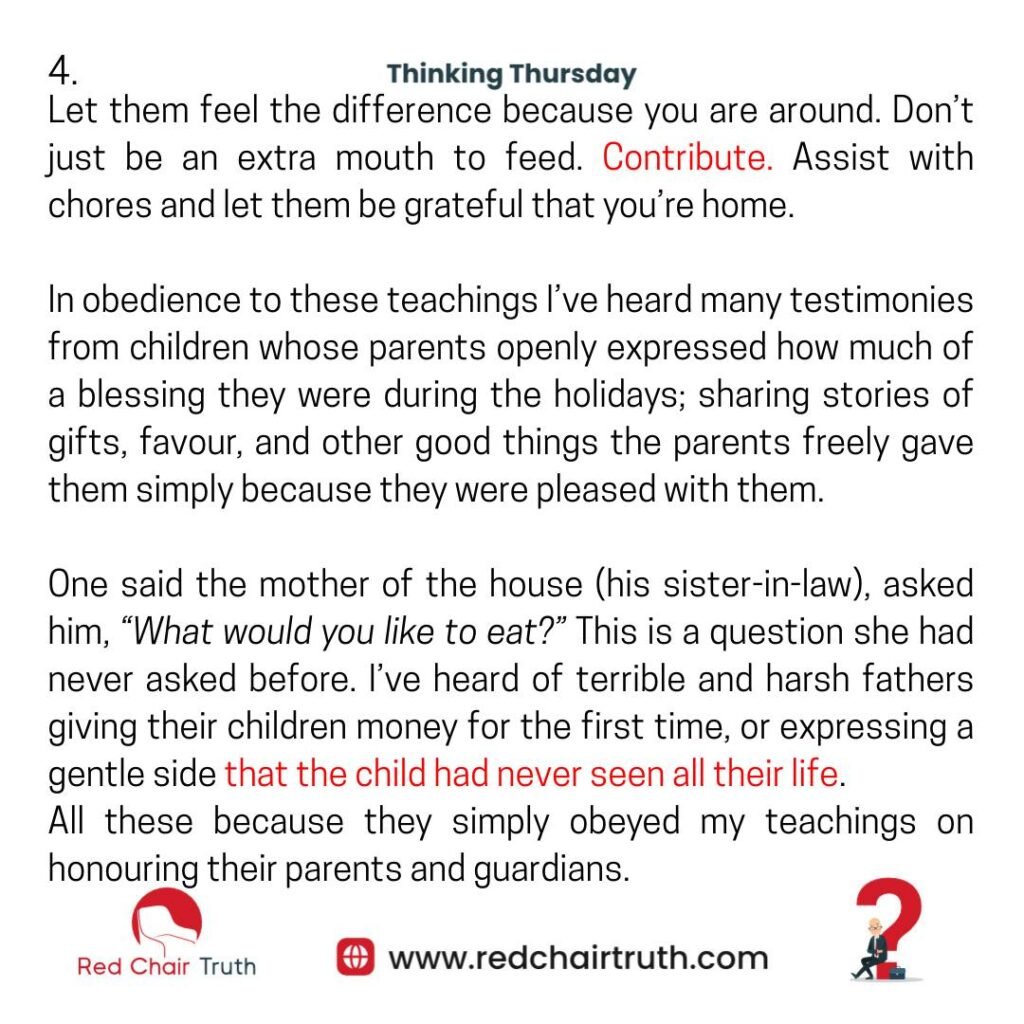 One said the mother of the house (his sister-in-law), asked him, “What would you like to eat?” This is a question she had never asked before. I’ve heard of terrible and harsh fathers giving their children money for the first time, or expressing a gentle side that the child had never seen all their life. All these because they simply obeyed my teachings on honouring their parents and guardians.