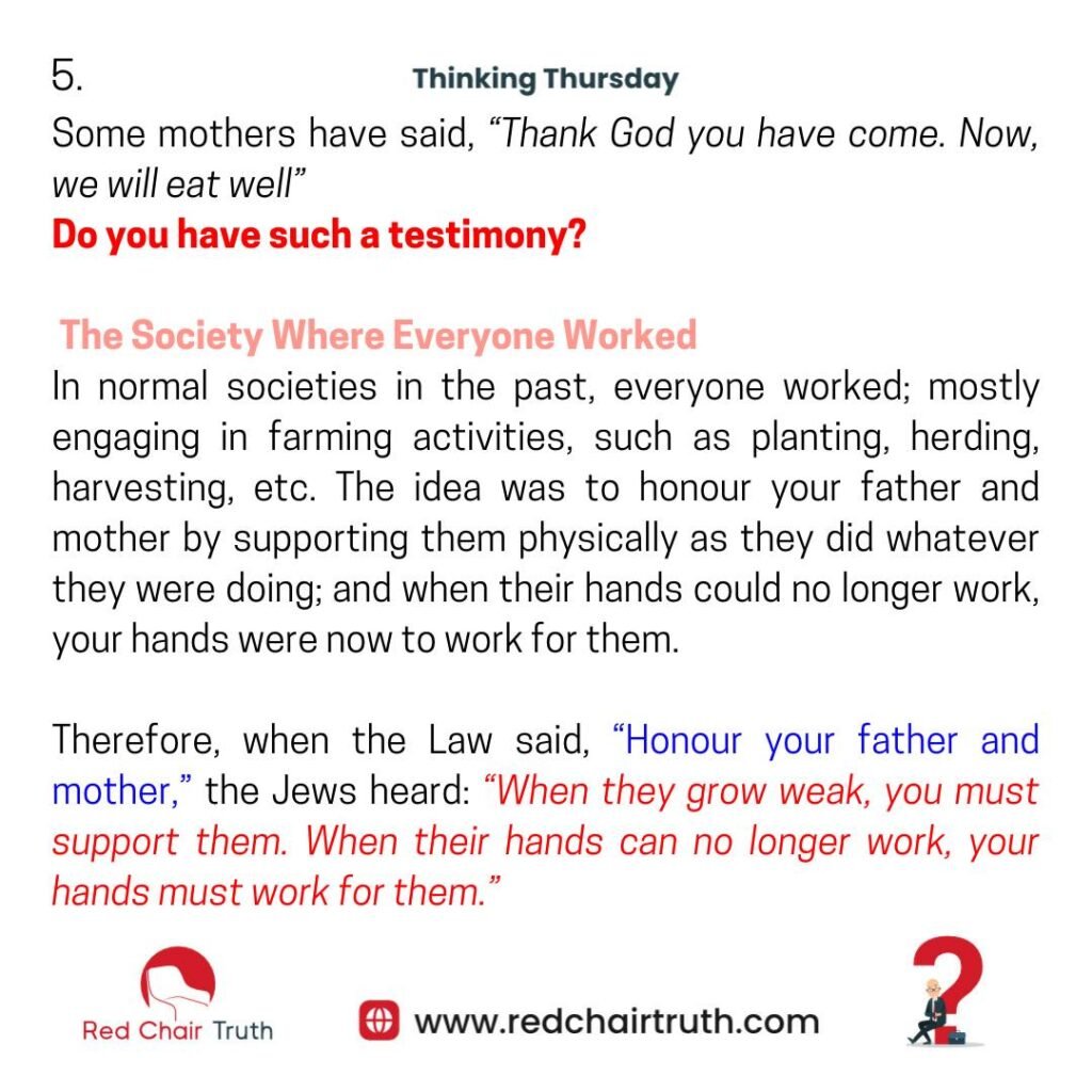 In normal societies in the past, everyone worked; mostly engaging in farming activities, such as planting, herding, harvesting, etc. The idea was to honour your father and mother by supporting them physically as they did whatever they were doing; and when their hands could no longer work, your hands were now to work for them.