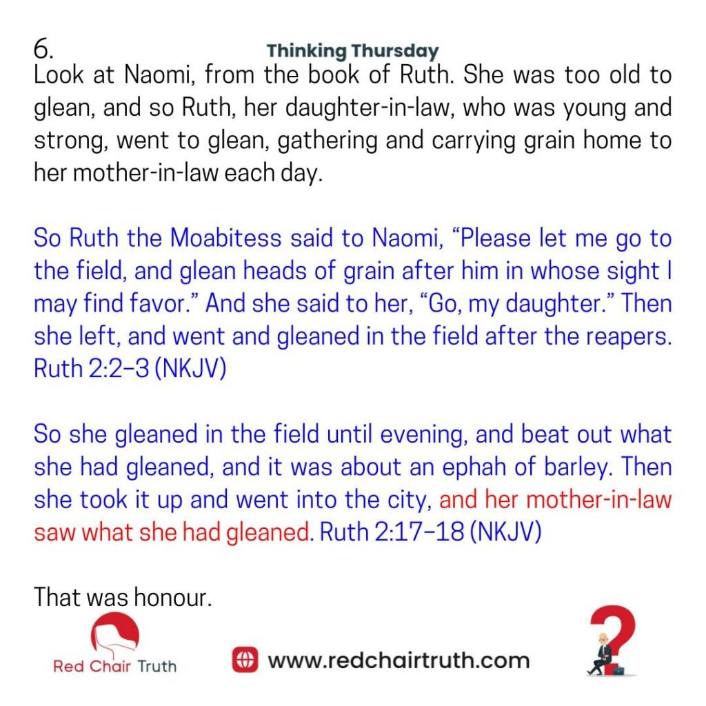 Look at Naomi, from the book of Ruth. She was too old to glean, and so Ruth, her daughter-in-law, who was young and strong, went to glean, gathering and carrying grain home to her mother-in-law each day.
