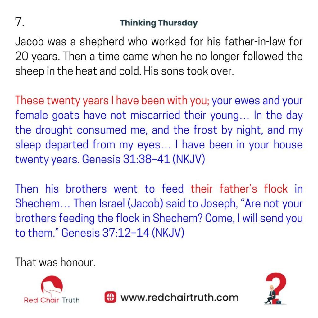 Jacob was a shepherd who worked for his father-in-law for 20 years. Then a time came when he no longer followed the sheep in the heat and cold. His sons took over.