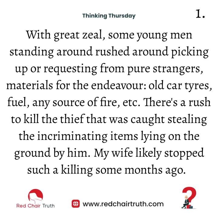 With great zeal, some young men standing around rushed around picking up or requesting from pure strangers, materials for the endeavour: old car tyres, fuel, any source of fire, etc. There’s a rush to enact justice by killing the thief who was caught stealing the incriminating items lying on the ground by him. My wife likely stopped such a killing some months ago.
