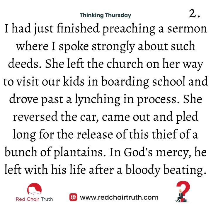 I had just finished preaching a sermon where I spoke strongly about such deeds. She left the church on her way to visit our kids in boarding school and drove past a lynching in progess. She reversed the car, came out and pled long for the release of this thief of a bunch of plantains. In God’s mercy, he left with his life after a bloody beating.