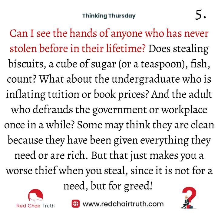 Can I see the hands of anyone who has never stolen before in their lifetime? Does stealing biscuits, a cube of sugar (or a teaspoon), fish, count? What about the undergraduate who is inflating tuition or book prices? And the adult who defrauds the government or workplace once in a while? Some may think they are clean because they have been given everything they need or are rich. But that just makes you a worse thief when you steal, since it is not for a need, but for greed!