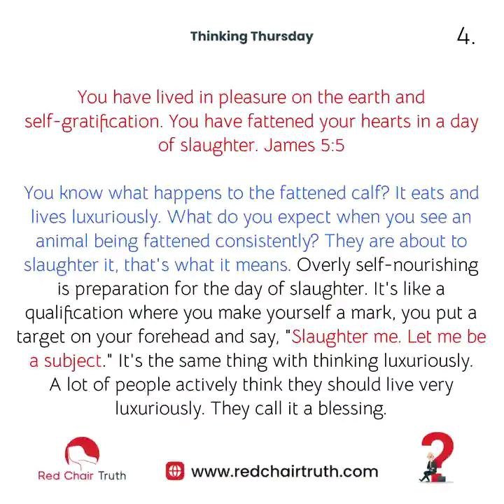 You know what happens to the fattened calf? It eats and lives luxuriously. What do you expect when you see an animal being fattened consistently? They are about to slaughter it, that’s what it means. Overly self-nourishing is preparation for the day of slaughter. It’s like a qualification where you make yourself a mark, you put a target on your forehead and say, “Slaughter me. Let me be a subject.” It’s the same thing with thinking luxuriously. A lot of people actively think they should live very luxuriously. They call it a blessing.
