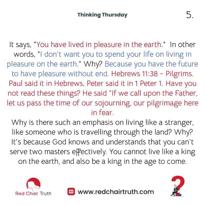 It says, “You have lived in pleasure in the earth.” In other words, “I don’t want you to spend your life on living in pleasure on the earth.” Why? Because you have the future to have pleasure without end. Hebrews 11:38 – Tells us that we are Pilgrims. Paul said it in Hebrews, Peter said it in 1 Peter 1. Have you not read these things? He said “If we call upon the Father, let us pass the time of our sojourning, our pilgrimage here in fear.