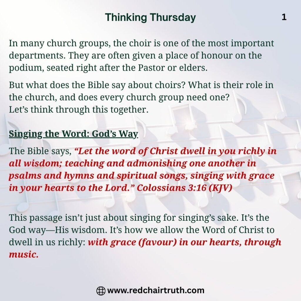 In many church groups, the choir is one of the most important departments. They are often given a place of honour on the podium, seated right after the Pastor or elders.
