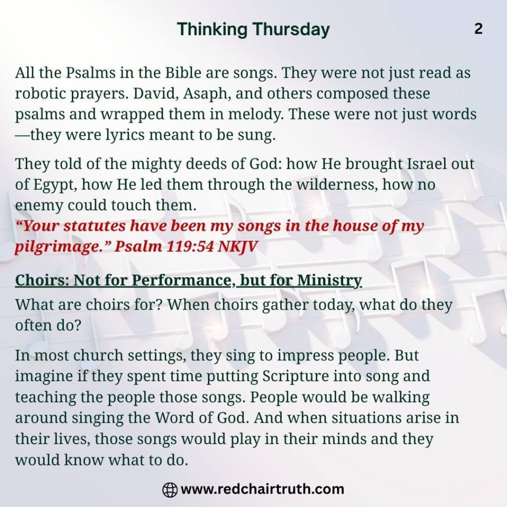 In most church settings, they sing to impress people. But imagine if they spent time putting Scripture into song and teaching the people those songs. People would be walking around singing the Word of God. And when situations arise in their lives, those songs would play in their minds and they would know what to do.