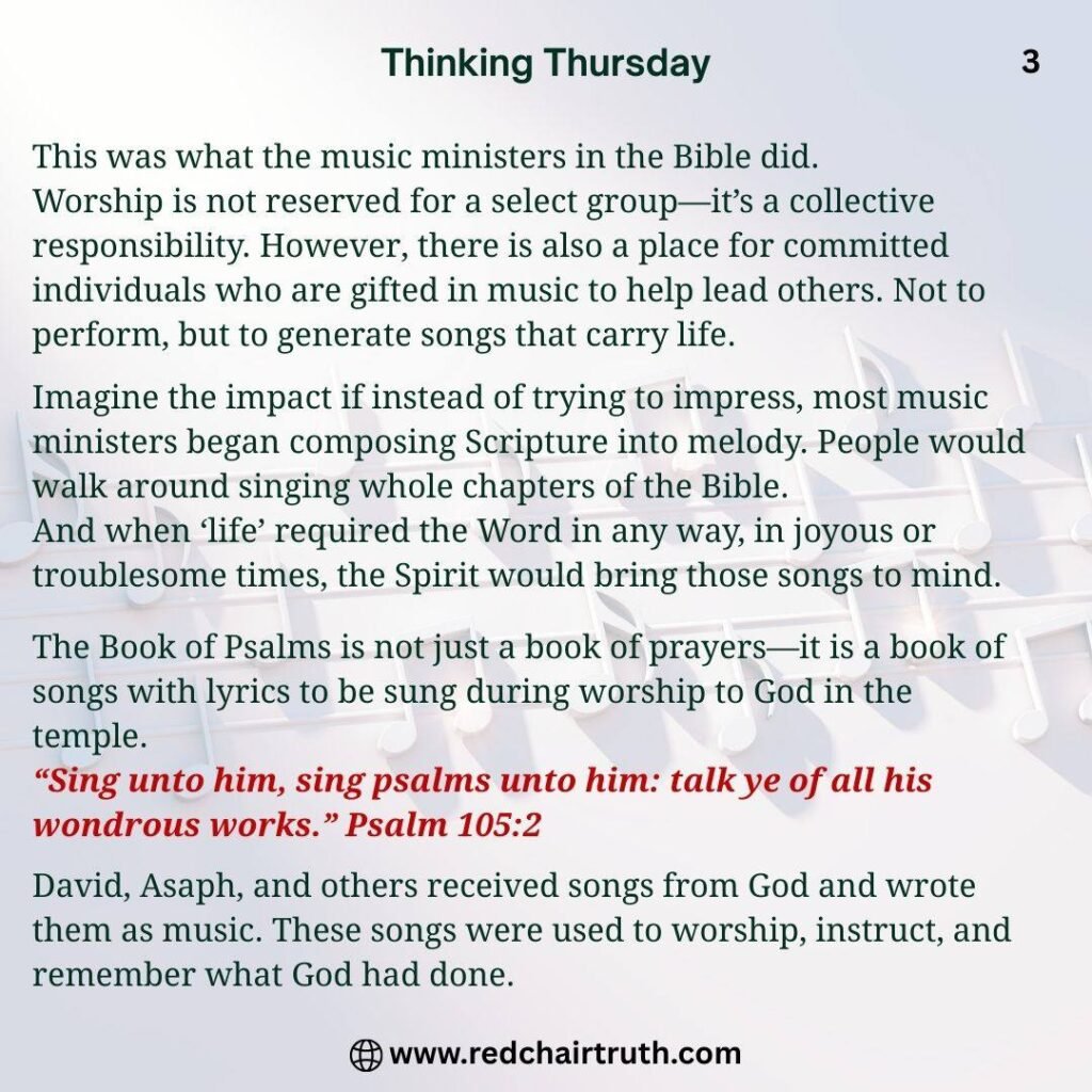 Worship is not reserved for a select group—it’s a collective responsibility. However, there is also a place for committed individuals who are gifted in music to help lead others. Not to perform, but to generate songs that carry life.