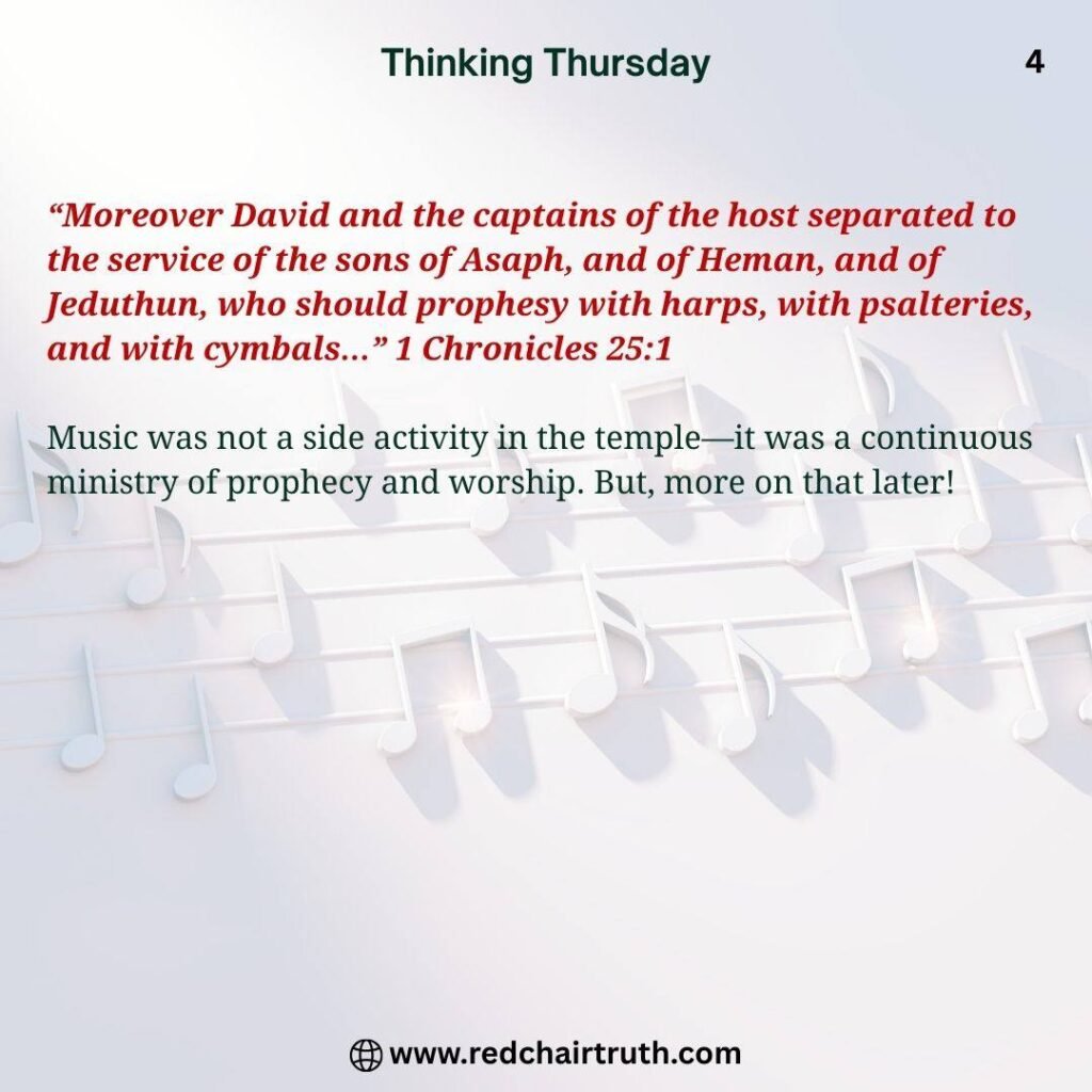 “Moreover David and the captains of the host separated to the service of the sons of Asaph, and of Heman, and of Jeduthun, who should prophesy with harps, with psalteries, and with cymbals…” 1 Chronicles 25:1Music was not a side activity in the temple—it was a continuous ministry of prophecy and worship. But, more on that later!