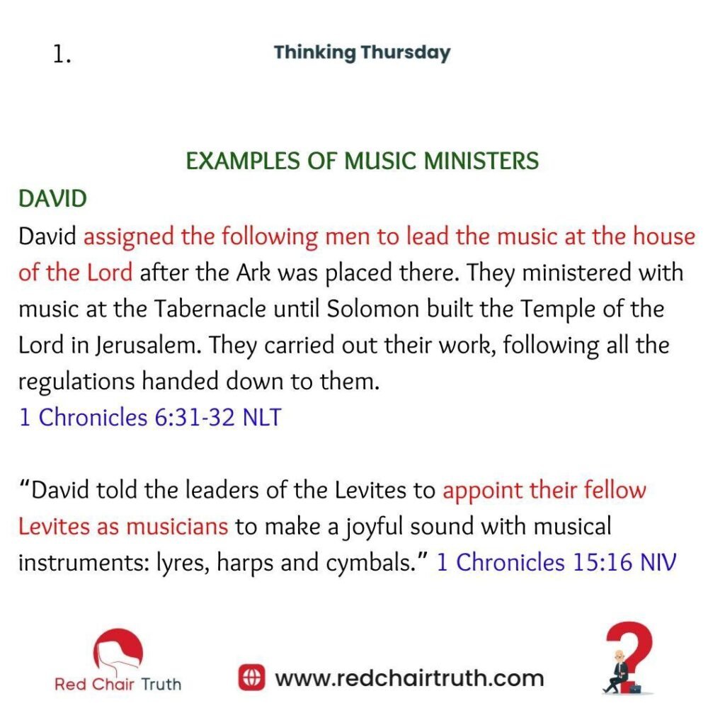 “David assigned the following men to lead the music at the house of the Lord after the Ark was placed there. They ministered with music at the Tabernacle until Solomon built the Temple of the Lord in Jerusalem. They carried out their work, following all the regulations handed down to them. 1 Chronicles 6:31-32 NLT