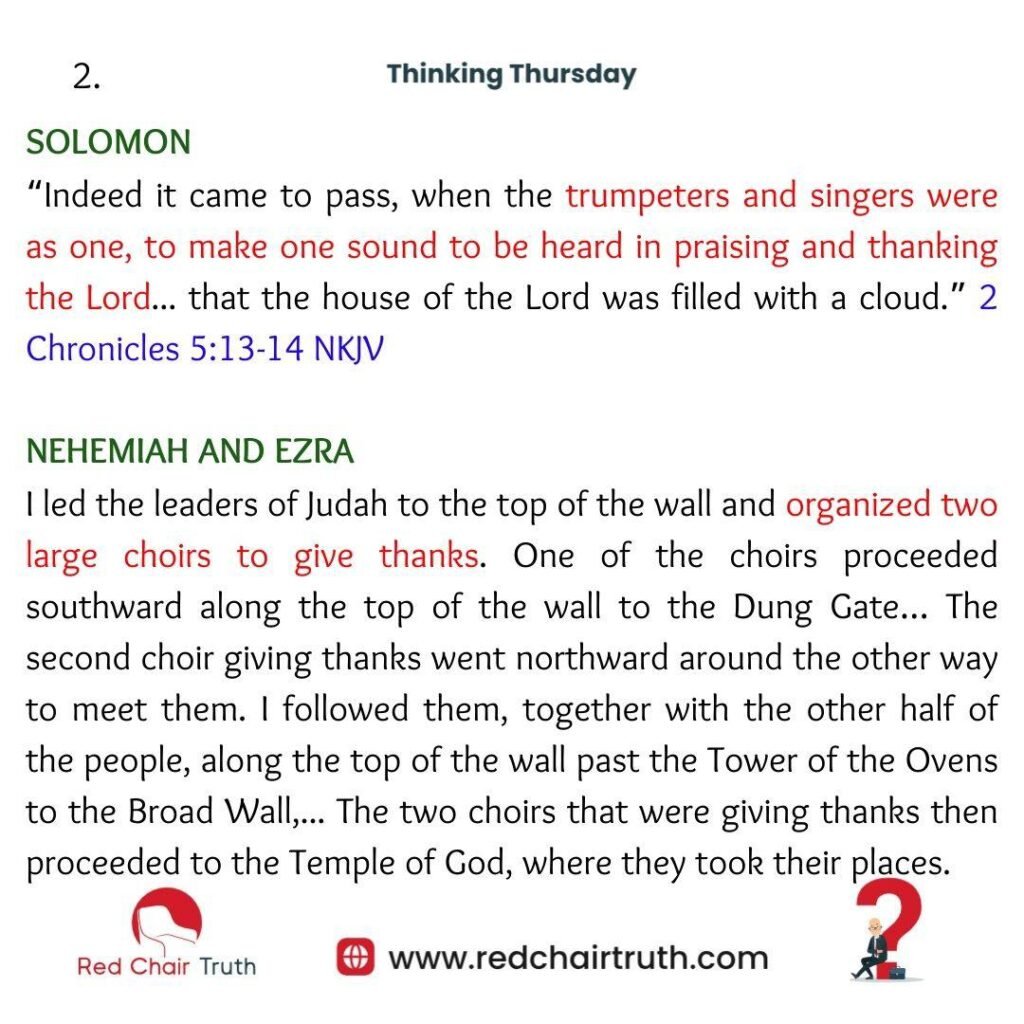 The passages above tell us about how different groups of choirs were organized to lead or represent the people in thanksgiving and worship, and they show the communal nature of worship in songs.