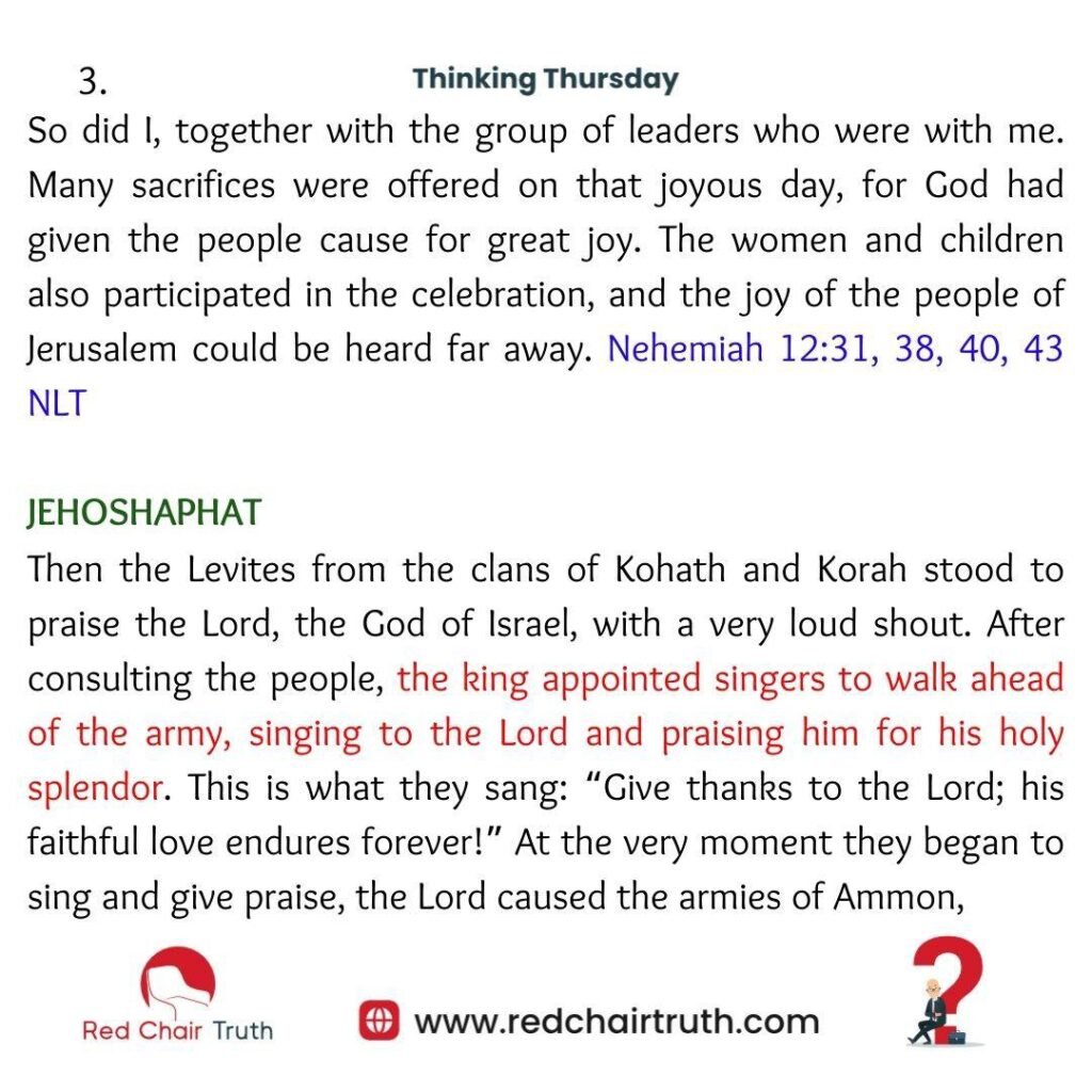 Then the Levites from the clans of Kohath and Korah stood to praise the Lord, the God of Israel, with a very loud shout. After consulting the people, the king appointed singers to walk ahead of the army, singing to the Lord and praising him for his holy splendor. This is what they sang: “Give thanks to the Lord; his faithful love endures forever!” At the very moment they began to sing and give praise, the Lord caused the armies of Ammon, Moab, and Mount Seir to start fighting among themselves. 2 Chronicles 20:19, 21-22 NLT