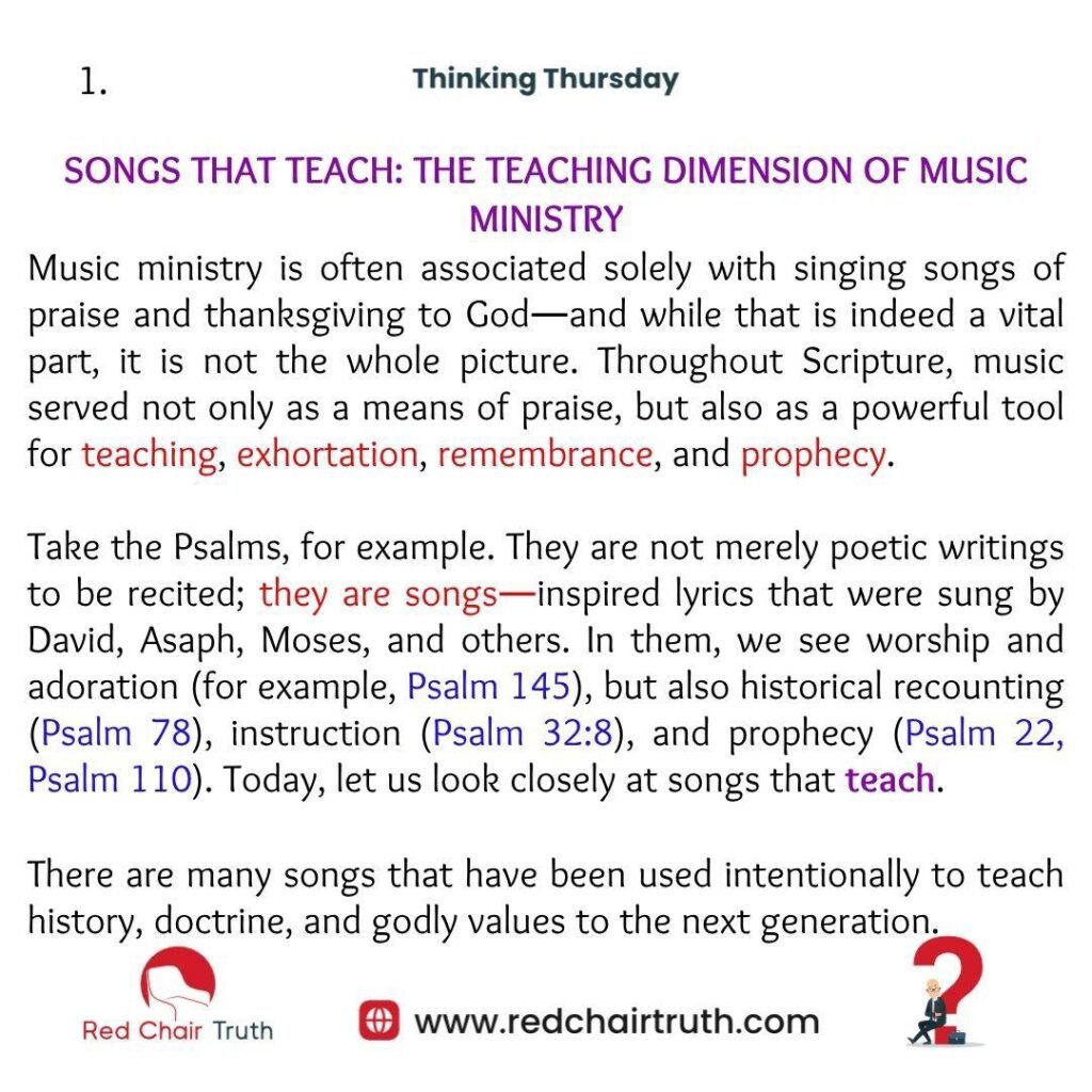 There are many songs that have been used intentionally to teach history, doctrine, and godly values to the next generation. These songs were not just sung for emotional or devotional purposes; they were crafted to instruct the people of God in His ways, character, commandments, and covenant. They are rich with lessons, shaping the spiritual lives of those who sang and listened to them.