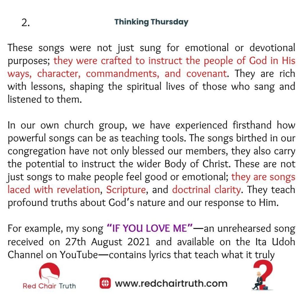 For example, my song “IF YOU LOVE ME”—an unrehearsed song received on 27th August 2021 and available on the Ita Udoh Channel on YouTube—contains lyrics that teach what it truly means to love the Lord. The lyrics say: