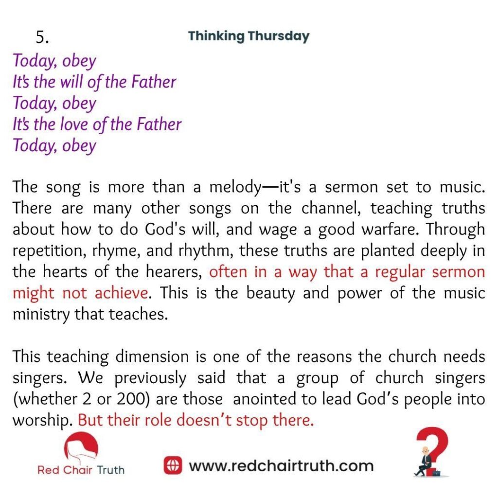This teaching dimension is one of the reasons the church needs singers. We previously said that a group of church singers (whether 2 or 200) are those anointed to lead God’s people into worship. But their role doesn’t stop there. If songs are meant to teach, then the music team must be equipped and anointed not just to sing, but to teach—through music. That means understanding the Word, walking in revelation, and being intentional about the lyrics they proclaim.