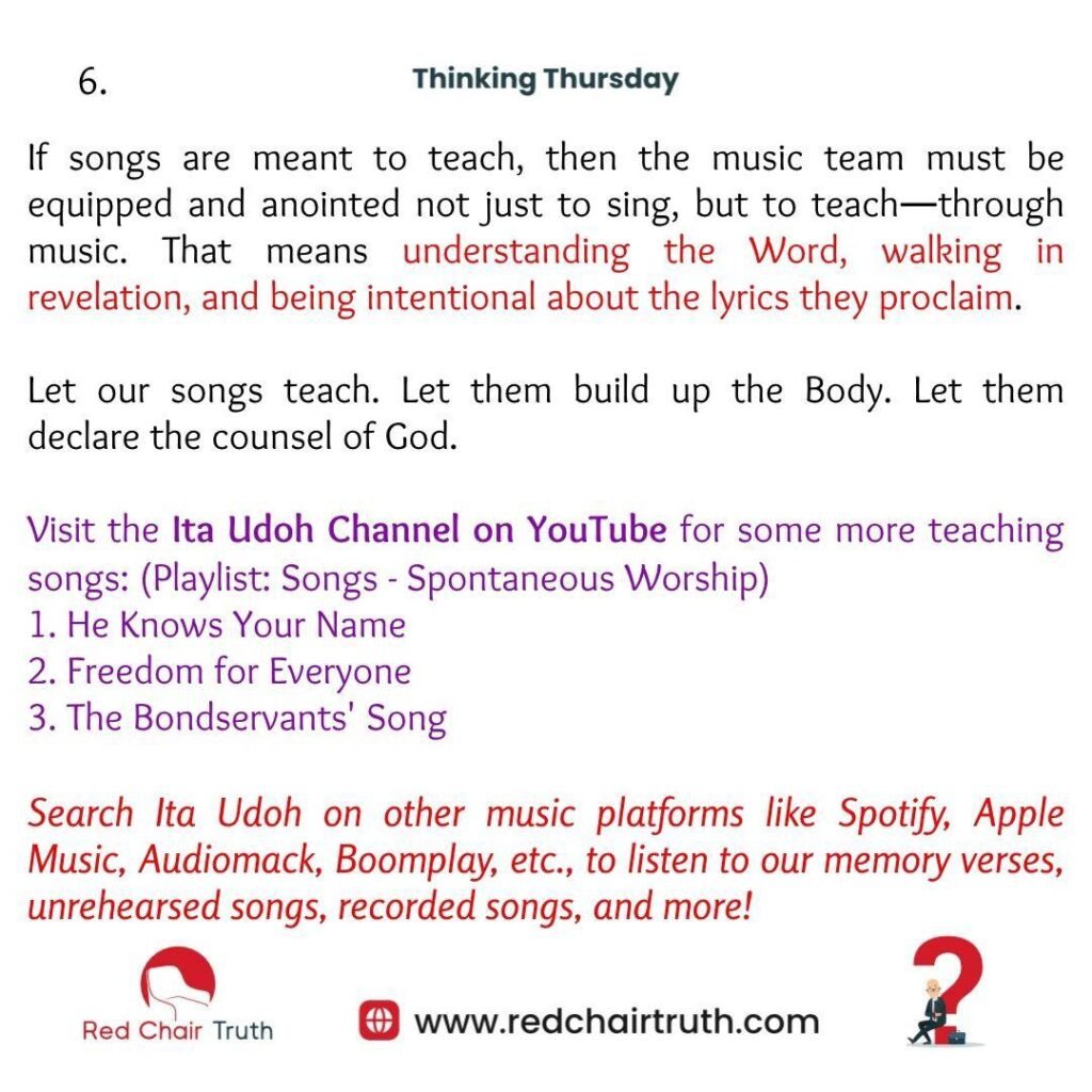 In our own church group, we have experienced firsthand how powerful songs can be as teaching tools. The songs birthed in our congregation have not only blessed our members, they also carry the potential to instruct the wider Body of Christ. These are not just songs to make people feel good or emotional; they are songs laced with revelation, Scripture, and doctrinal clarity. They teach profound truths about God’s nature and our response to Him.