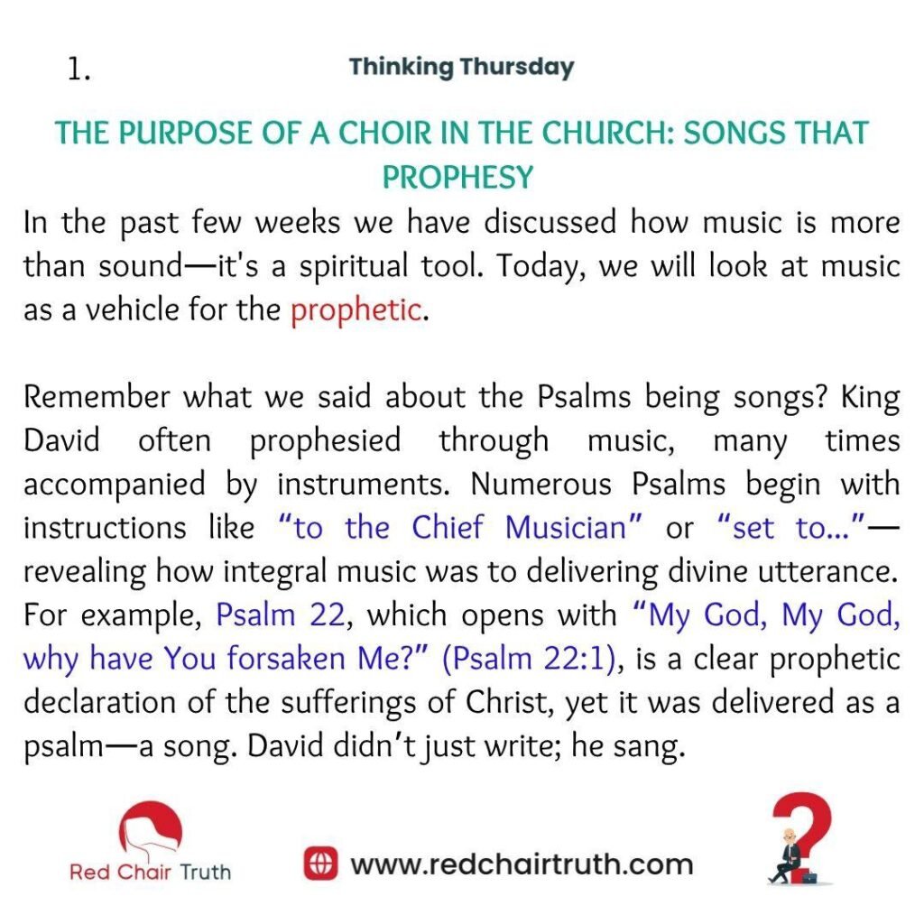 For example, Psalm 22, which opens with “My God, My God, why have You forsaken Me?” (Psalm 22:1), is a clear prophetic declaration of the sufferings of Christ, yet it was delivered as a psalm—a song. David didn’t just write; he sang. He didn’t just sing, he prophesied. “David spoke to the Lord the words of this song…” (2 Samuel 22:1). Music, then, is not merely aesthetic—it is prophetic.