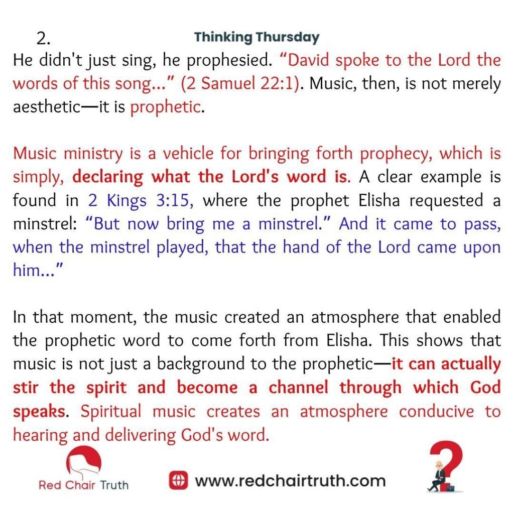 In that moment, the music created an atmosphere that enabled the prophetic word to come forth from Elisha. This shows that music is not just a background to the prophetic—it can actually stir the spirit and become a channel through which God speaks. Spiritual music creates an atmosphere conducive to hearing and delivering God’s word.