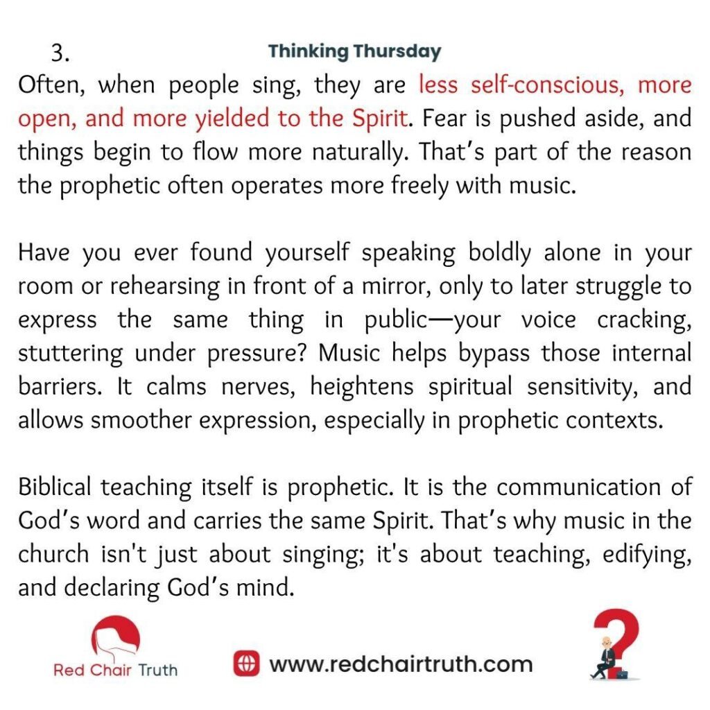 Biblical teaching itself is prophetic. It is the communication of God’s word and carries the same Spirit. That’s why music in the church isn’t just about singing; it’s about teaching, edifying, and declaring God’s mind. True Christian music carries revelation—it helps people hear God, and it helps people speak for God. “Let the word of Christ dwell in you richly in all wisdom, teaching and admonishing one another in psalms and hymns and spiritual songs…” (Colossians 3:16).