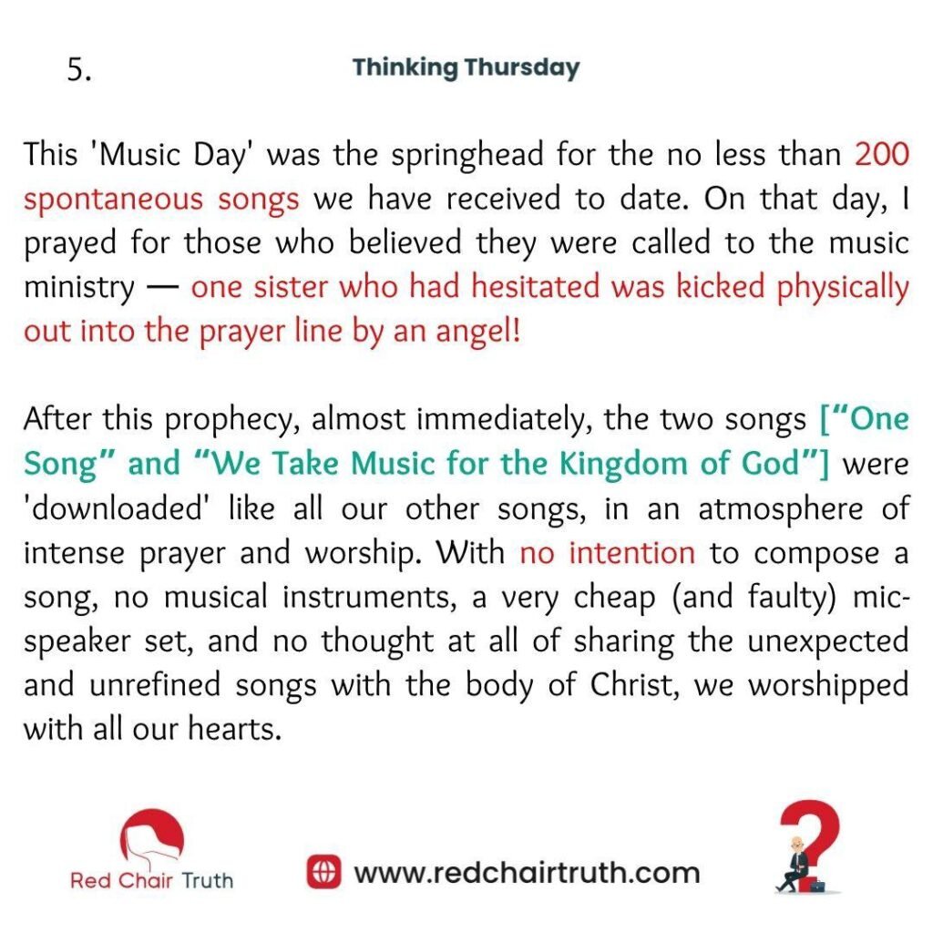 After this prophecy, almost immediately, the two songs [“One Song” and “We Take Music for the Kingdom of God”] were ‘downloaded’ like all our other songs, in an atmosphere of intense prayer and worship. With no intention to compose a song, no musical instruments, a very cheap (and faulty) mic-speaker set, and no thought at all of sharing the unexpected and unrefined songs with the body of Christ, we worshipped with all our hearts.