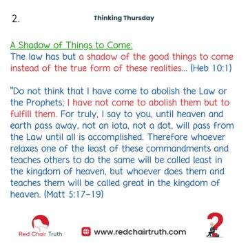 Therefore let no one pass judgment on you in questions of food and drink, or with regard to a festival or a new moon or a Sabbath. These are a shadow of the things to come, but the substance belongs to Christ. (Col 2:16-17)