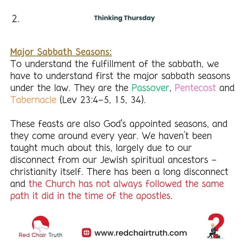 To understand the fulfilment of the sabbath, we have to understand first the major sabbath seasons under the law. They are the Passover, Pentecost, and Tabernacle (Lev 23:4-5, 15, 34).