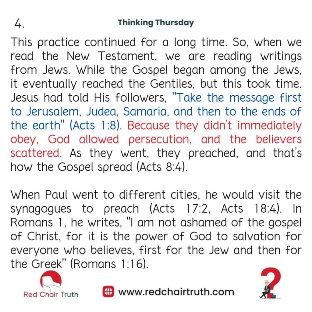 When Paul went to different cities, he would visit the synagogues to preach (Acts 17:2, Acts 18:4). In Romans 1, he writes, “I am not ashamed of the gospel of Christ, for it is the power of God to salvation for everyone who believes, first for the Jew and then for the Greek” (Romans 1:16).