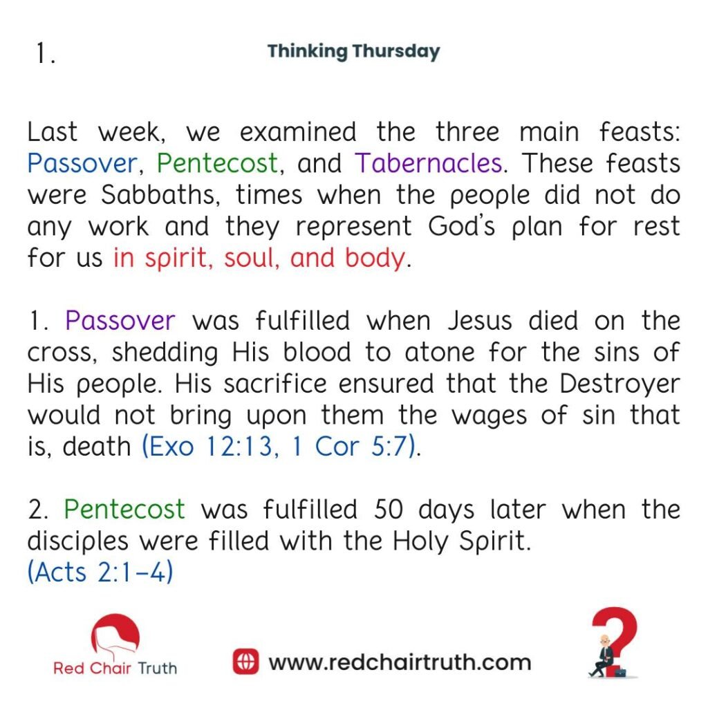 Last time, we examined the three main feasts: Passover, Pentecost, and Tabernacles. These feasts were Sabbaths, times when the people did not do any work and they represent God’s plan for rest for us—in spirit, soul, and body.