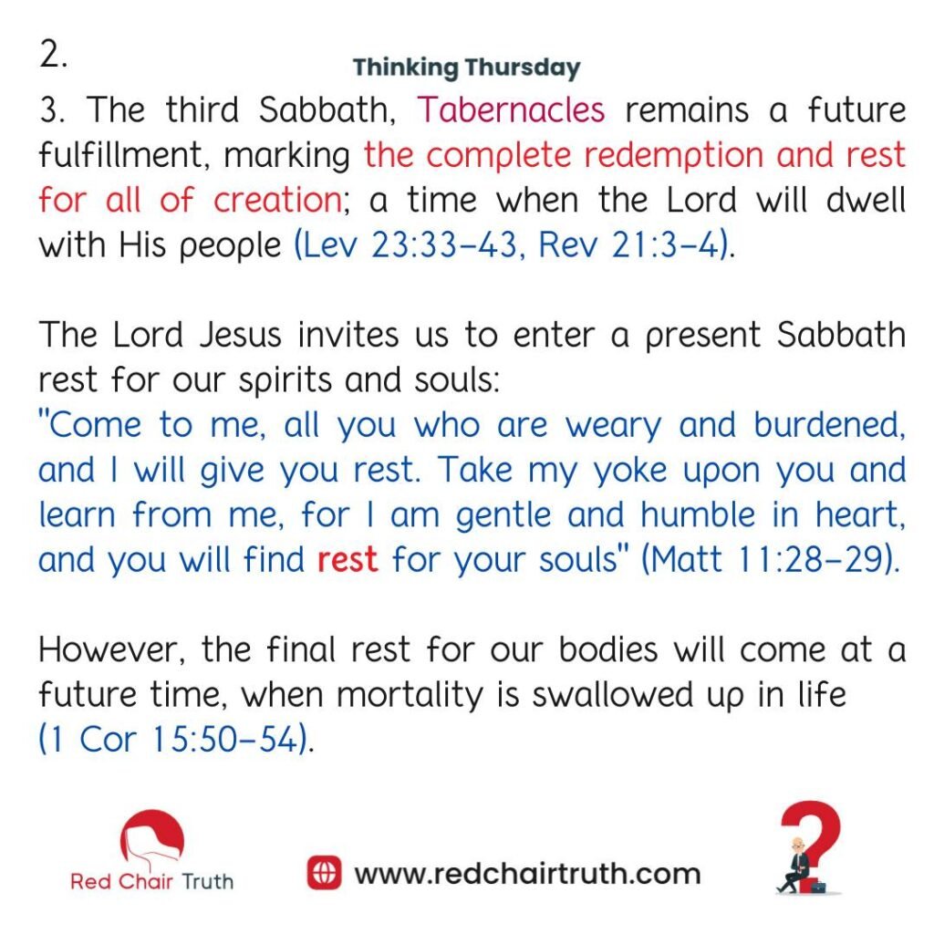 3. The Third Sabbath, Tabernacles remains a future fulfillment, marking the complete redemption and rest for all of creation; a time when the Lord will dwell with His people (Lev 23:33-43, Rev 21:3-4).