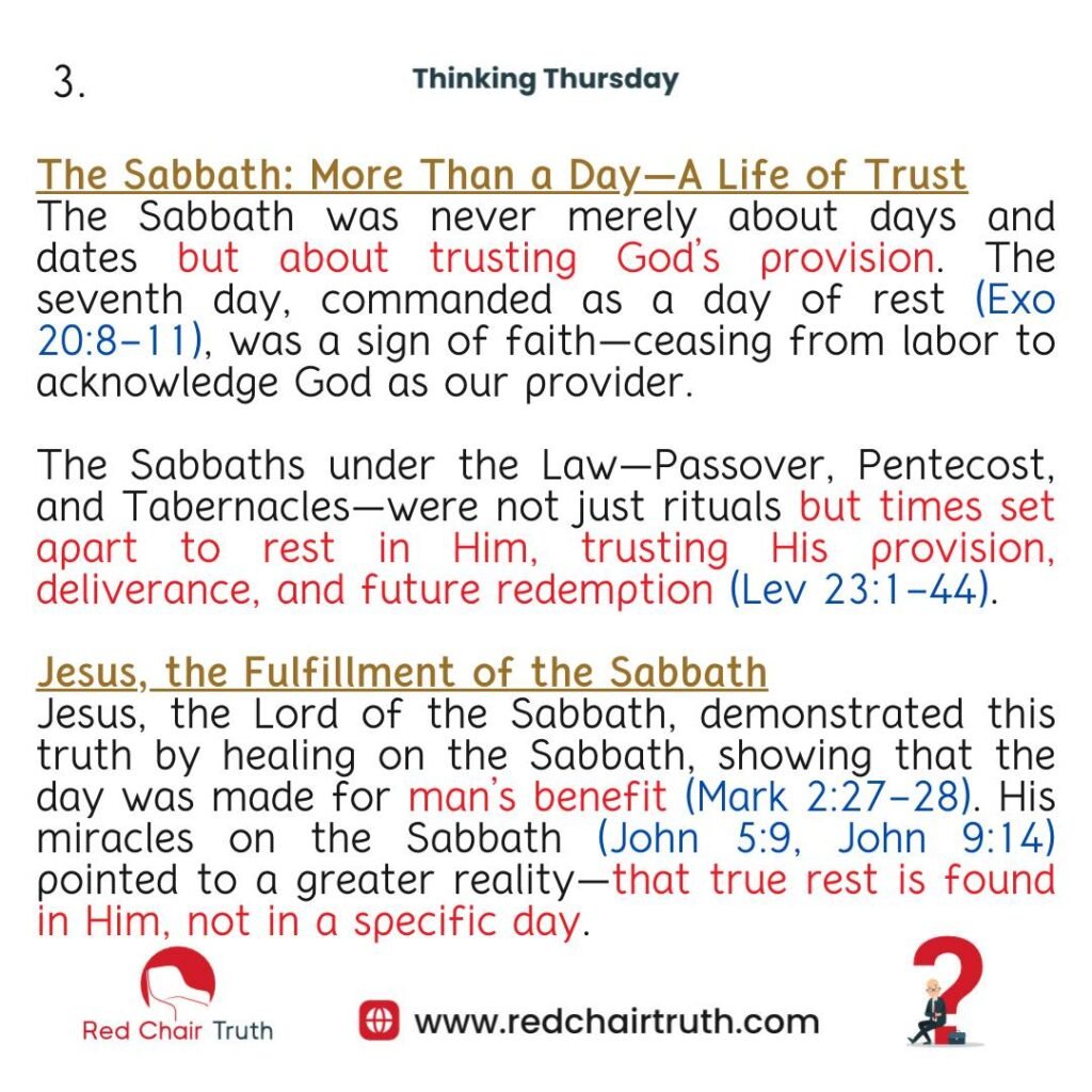 Jesus, the Lord of the Sabbath, demonstrated this truth by healing on the Sabbath, showing that the day was made for man’s benefit (Mark 2:27-28). His miracles on the Sabbath (John 5:9, John 9:14) pointed to a greater reality—that true rest is found in Him, not in a specific day.