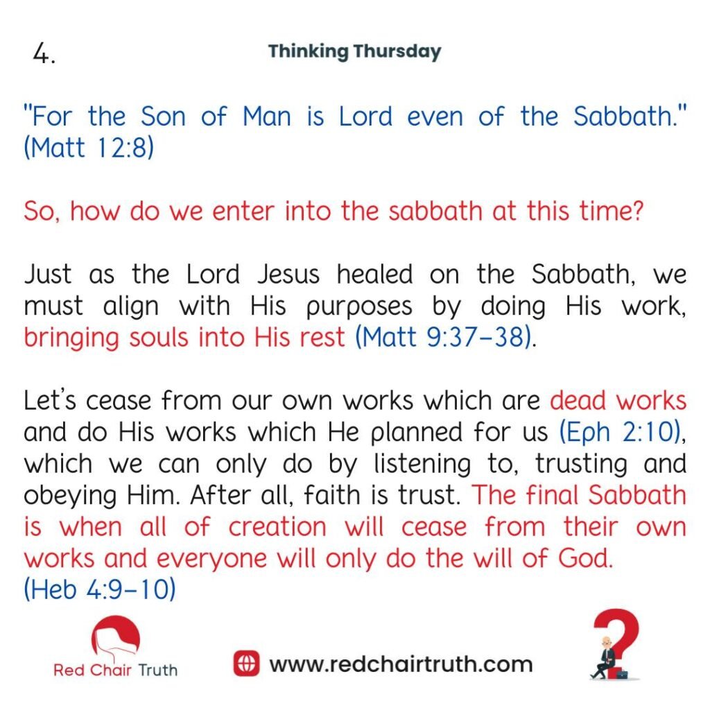 Let’s not adopt the Pharisaic mindset of resisting good works, but instead, embrace the harvest. The Sabbath on one end, is a life of faith, trusting God’s provision and ceasing from our own works to rely on His grace, while we await the fulfillment of the final Sabbath, a time when everyone will cease from work (Heb 4:9-10).