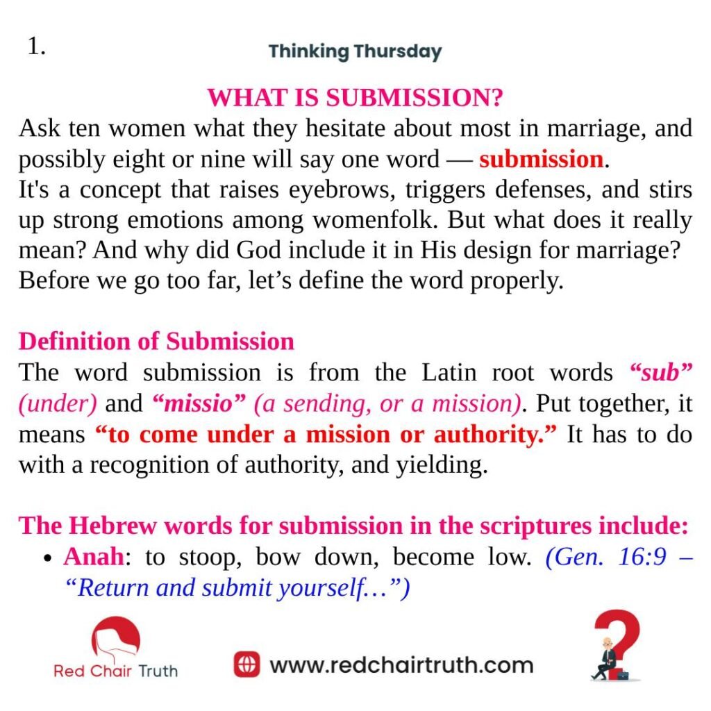 The word submission is from the Latin root words “sub” (under) and “missio” (a sending, or a mission). Put together, it means “to come under a mission or authority.” It has to do with a recognition of authority, and yielding.