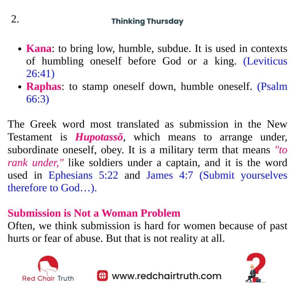 The Greek word most translated as submission in the New Testament is Hupotassō, which means to arrange under, subordinate oneself, obey. It is a military term that means “to rank under,” like soldiers under a captain, and it is the word used in Ephesians 5:22 and James 4:7 (Submit yourselves therefore to God…).
