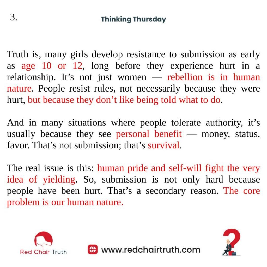 The real issue is this: human pride and self-will fight the very idea of yielding. So, submission is not only hard because people have been hurt. That’s a secondary reason. The core problem is our human nature.