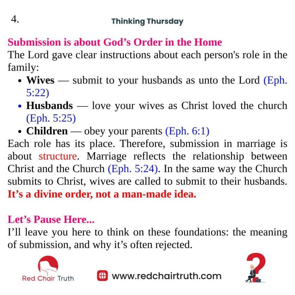 Each role has its place. Therefore, submission in marriage is about structure. Marriage reflects the relationship between Christ and the Church (Eph. 5:24). In the same way the Church submits to Christ, wives are called to submit to their husbands. It’s a divine order — not a man-made idea.