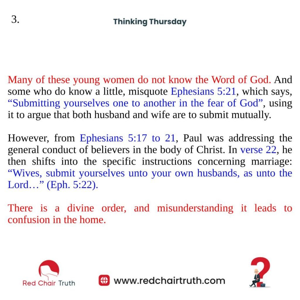 Many of these young women do not know the Word of God. And some who do know a little, misquote Ephesians 5:21, which says, “Submitting yourselves one to another in the fear of God”, using it to argue that both husband and wife are to submit mutually.