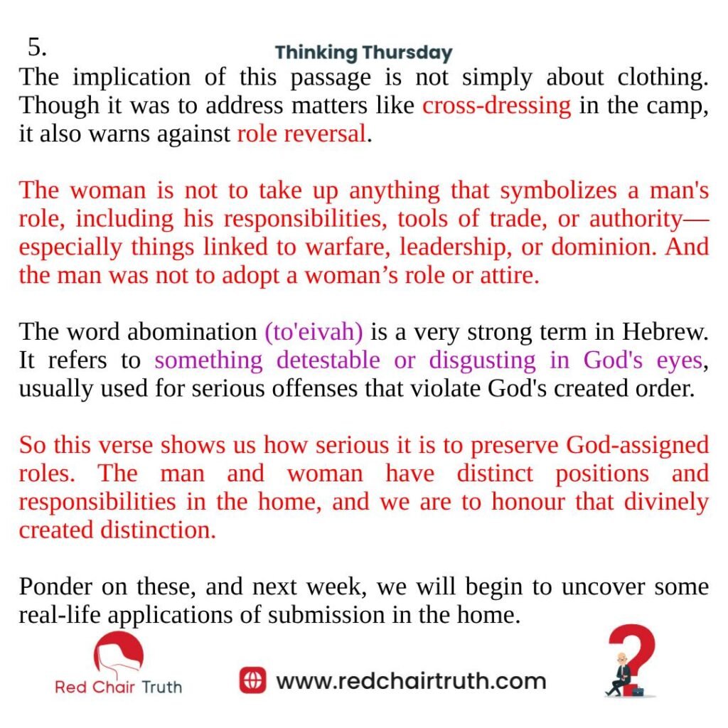 The Hebrew for “a woman’s garment” are the words “simlaw” and “ishah”. Simlaw means outer garment, clothing, or covering — in this case, referring to literal female attire, while ishah means a woman or wife. So, “simlaw ishah” refers to a woman’s dress or clothing. The implication of this passage is not simply about clothing. Though it was to address matters like cross-dressing in the camp, it also warns against role reversal.