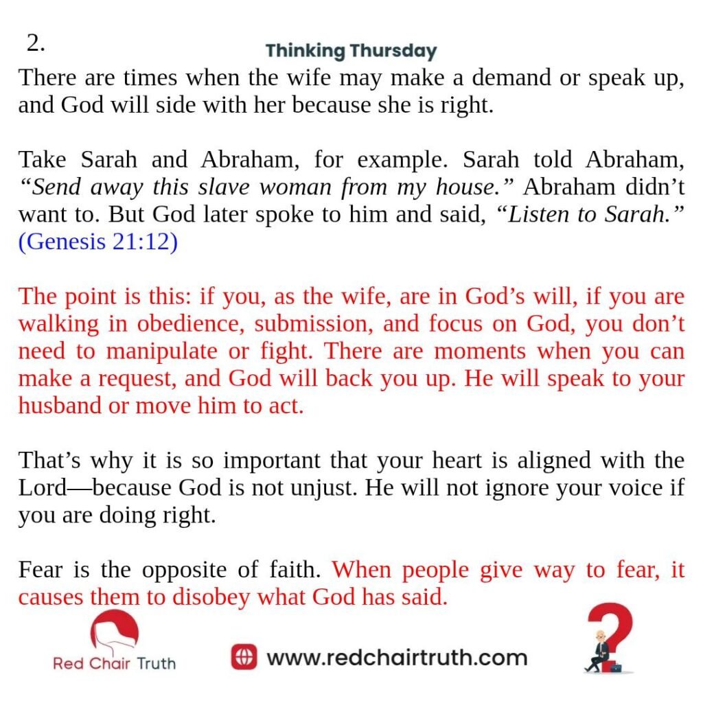 The point is this: if you, as the wife, are in God’s will, if you are walking in obedience, submission, and focus on God, you don’t need to manipulate or fight. There are moments when you can make a request, and God will back you up. He will speak to your husband or move him to act.