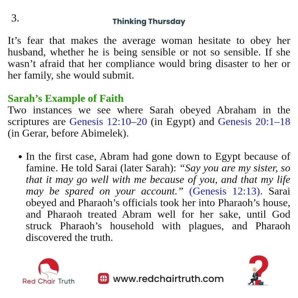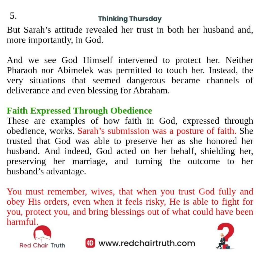 These are examples of how faith in God, expressed through obedience, works. Sarah’s submission was a posture of faith. She trusted that God was able to preserve her as she honored her husband. And indeed, God acted on her behalf, shielding her, preserving her marriage, and turning the outcome to her husband’s advantage.