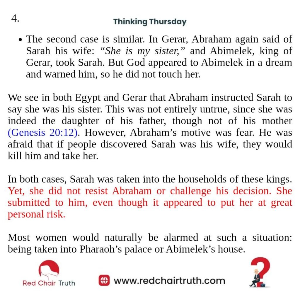 In both cases, Sarah was taken into the households of these kings. Yet, she did not resist Abraham or challenge his decision. She submitted to him, even though it appeared to put her at great personal risk.