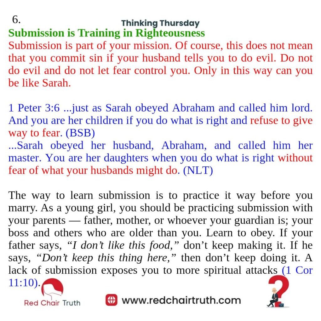 Submission is part of your mission. Of course, this does not mean that you commit sin if your husband tells you to do evil. Do not do evil and do not let fear control you. Only in this way can you be like Sarah.
