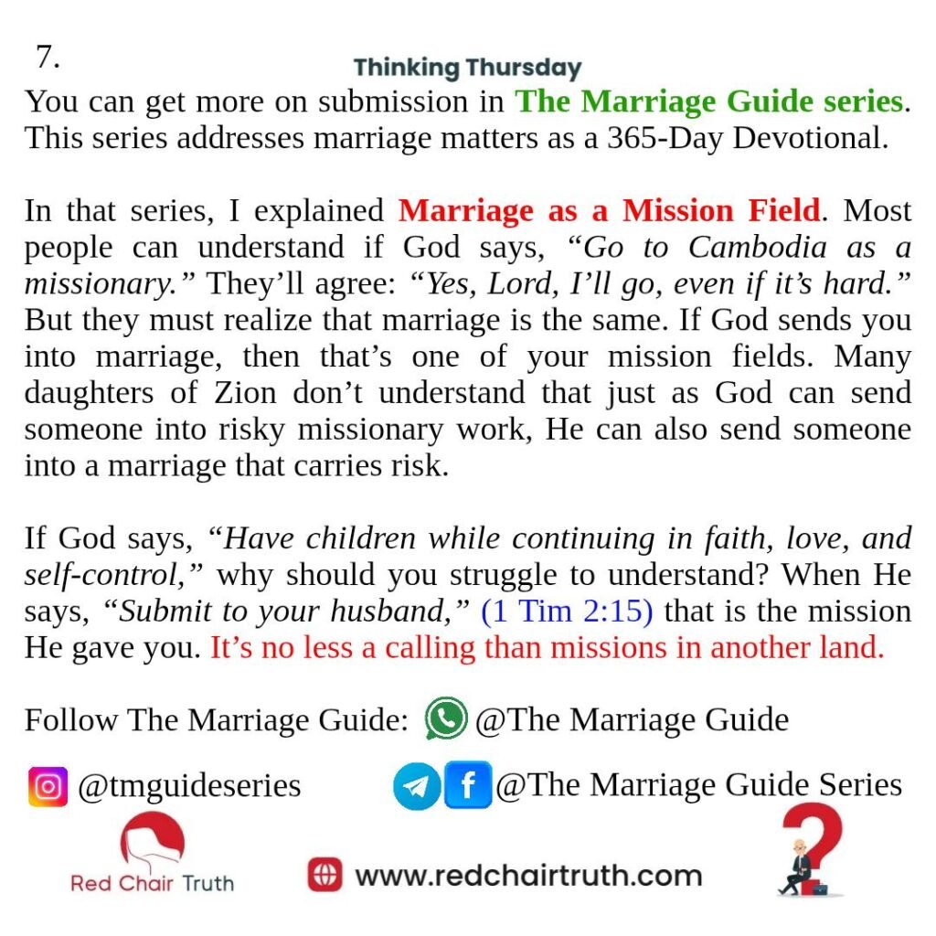 In that series, I explained Marriage as a Mission Field. Most people can understand if God says, “Go to Cambodia as a missionary.” They’ll agree: “Yes, Lord, I’ll go, even if it’s hard.” But they must realize that marriage is the same. If God sends you into marriage, then that’s one of your mission fields. Many daughters of Zion don’t understand that just as God can send someone into risky missionary work, He can also send someone into a marriage that carries risk.